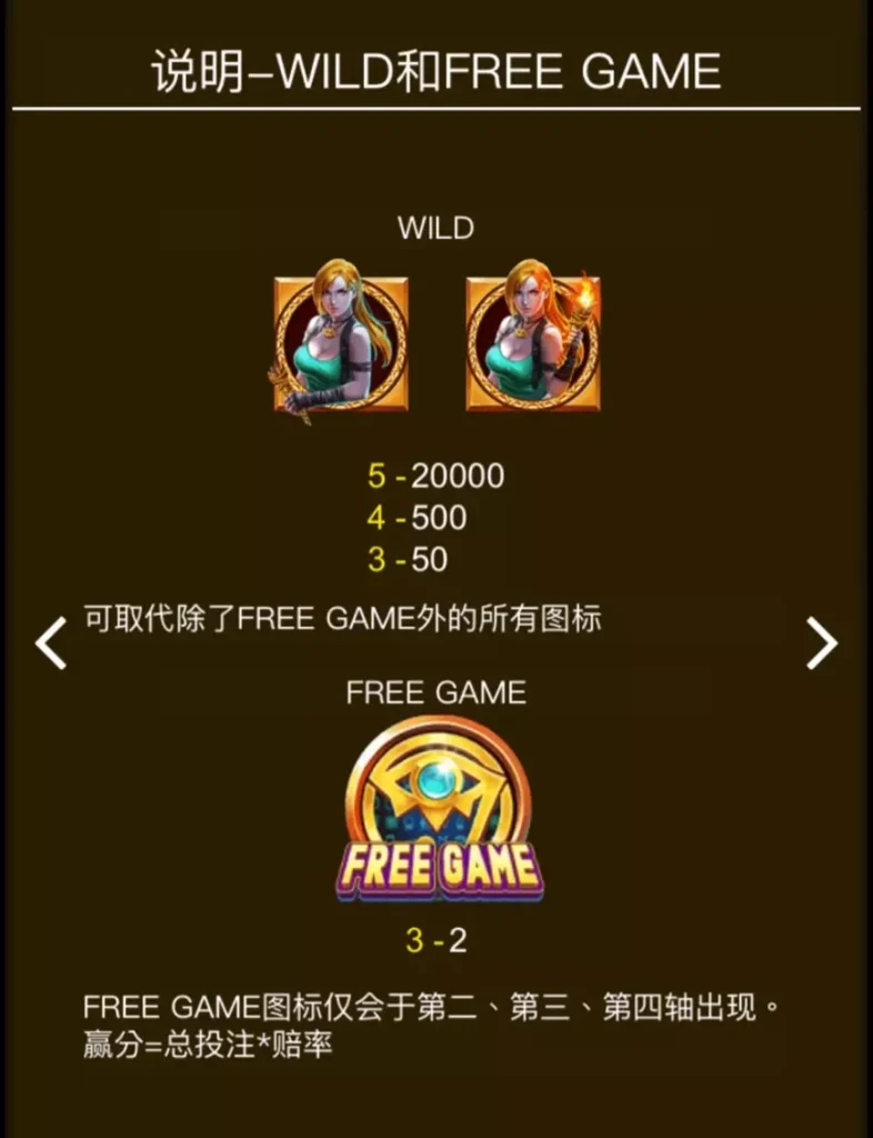 免費遊戲符號是玩家進入免費遊戲模式的鑰匙,僅出現在第二、第三及第四卷軸。單局出現三個或更多免費遊戲符號,即可觸發免費遊戲。
