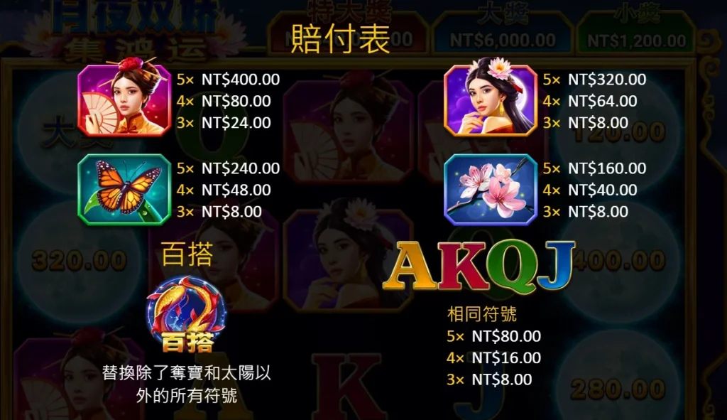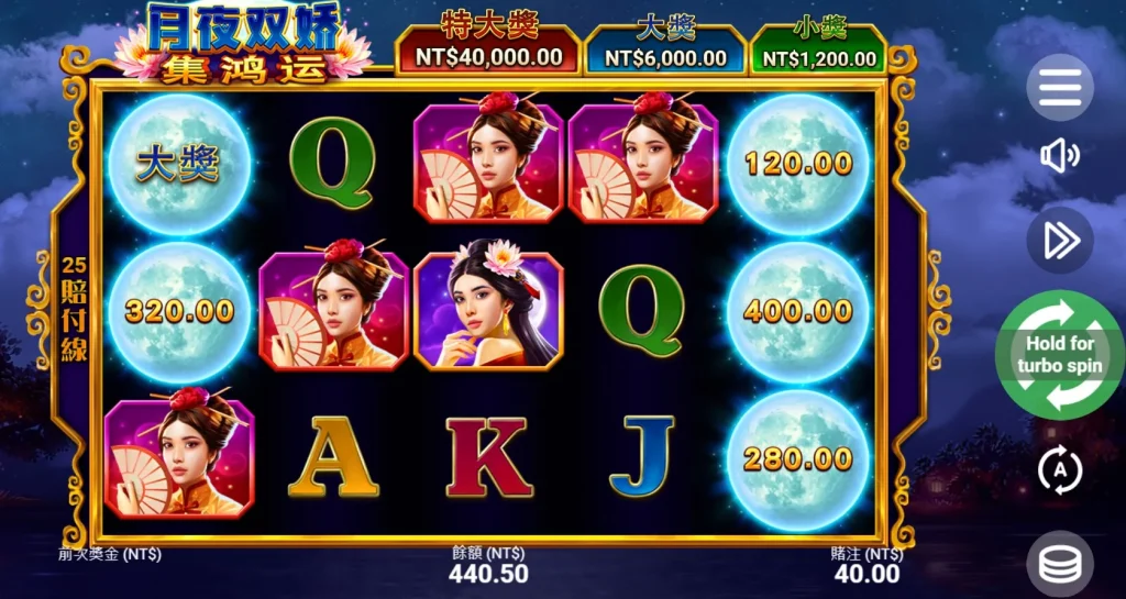 月夜雙嬌集鴻運的遊戲規則簡單易懂,最低下注金額為2.5元,最高可達2000元,玩家可以根據個人預算靈活調整注碼。當轉軸停止時,出現相同圖案連線即可獲得獎金,計算方式為下注額乘以賠率,機會多多,回報豐厚。