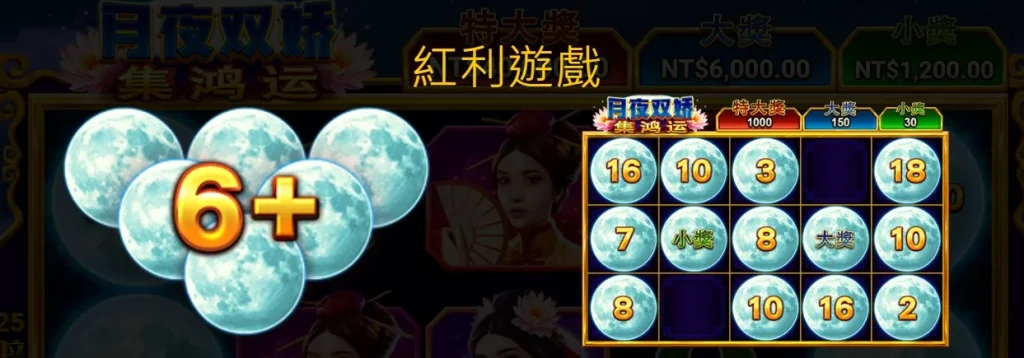 月夜雙嬌集鴻運老虎機小編覺得特別吸引人的是紅利遊戲功能,當轉軸上出現6個以上的月亮符號時,紅利遊戲將被觸發。在紅利遊戲中,所有月亮符號將被鎖定,並啟動3次「再轉一次」機會。
