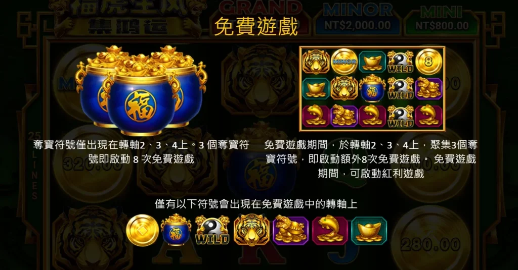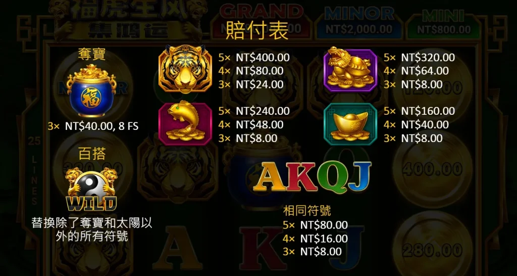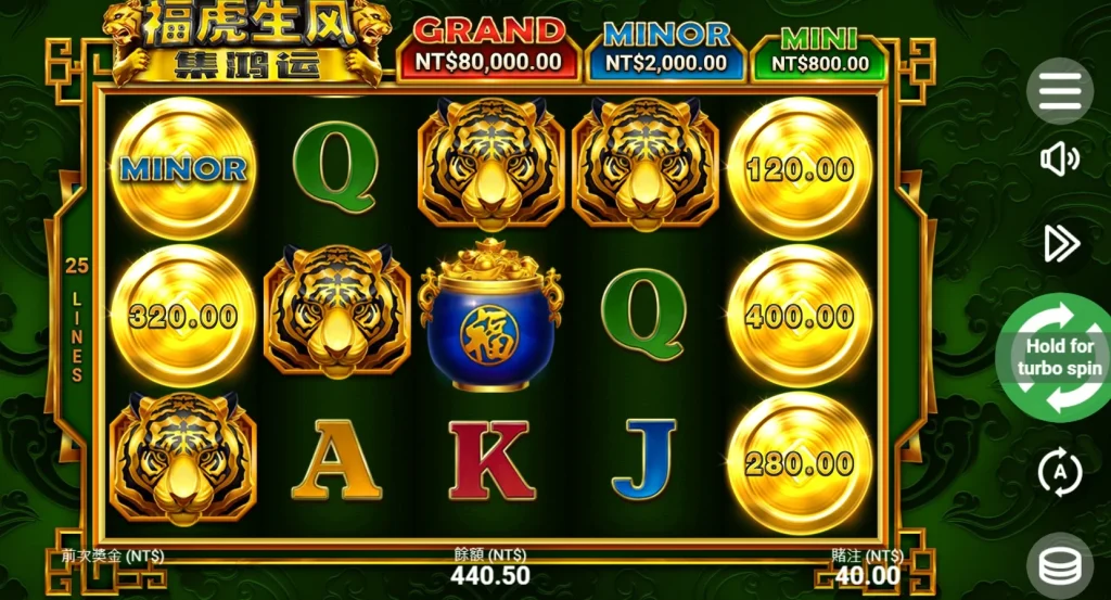 福虎生風集鴻運是BNG電子推出的一款經典3×5軸老虎機,擁有25條賠付線,主題圍繞著中國傳統文化中的吉祥象徵。遊戲的圖案設計精緻,包括金虎、福袋和金錢幣,處處展現著財富與好運,讓人彷彿進入了一個吉祥如意的財富世界。