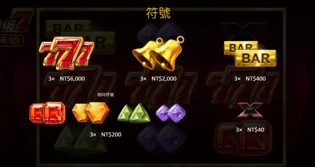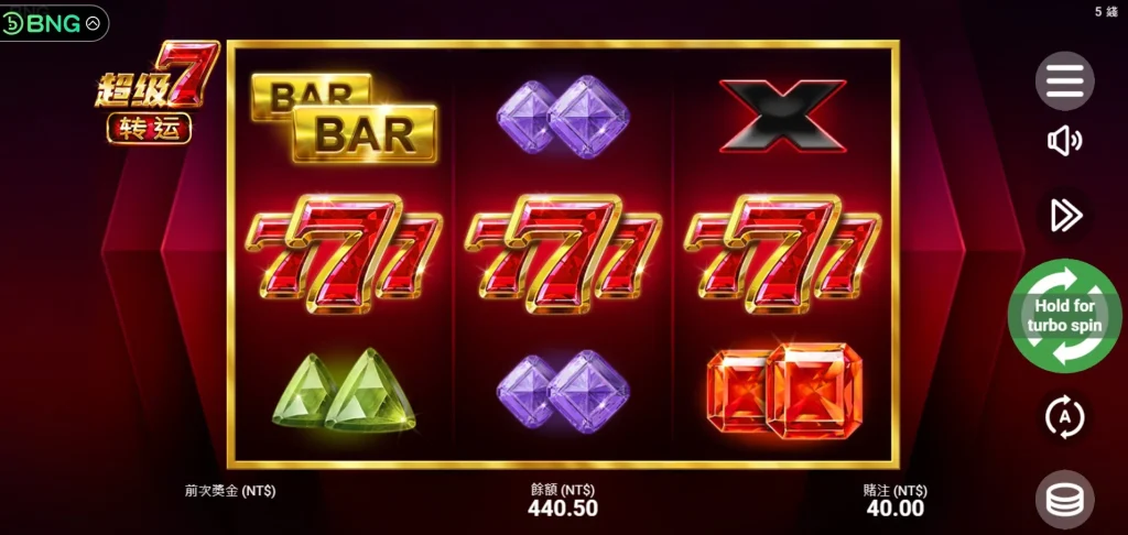 綜觀BNG電子最值得推薦的老虎機遊戲,小編認為就是超級7轉運了,超級7轉運是BNG電子出品的一款經典3軸老虎機,擁有5條賠付線,設計靈感來自傳統的777老虎機,所以對於玩家來說一點都不會陌生。