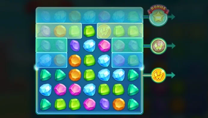 水晶之國的核心玩法是寶石連線消除,只要相同圖案的寶石連成一線,就能觸發消除並獲得得分。部分遊戲區域可能被封鎖,需透過贏得組合來解鎖。當特定行解鎖後,還有額外獎勵等著玩家。