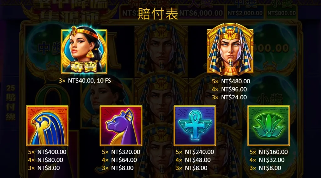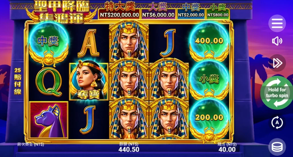聖甲降臨集鴻運是一款3×5軸的老虎機,共有25條賠付線。玩家只需輕鬆轉動滾輪,在神秘的金字塔背景中,隨著法老與埃及女王等經典符號的出現,即可進入一場探索古文明寶藏的奇幻冒險。