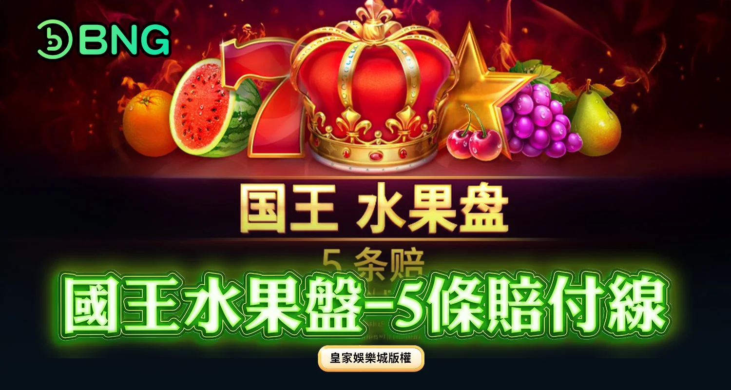 小編今天要介紹的是BNG電子旗下的經典老虎機遊戲國王水果盤5條賠付線,這是一款兼具經典與現代風格的遊戲,擁有豐富的中獎機會與簡單易懂的規則,絕對是新手與資深玩家都不能錯過的熱門機台!