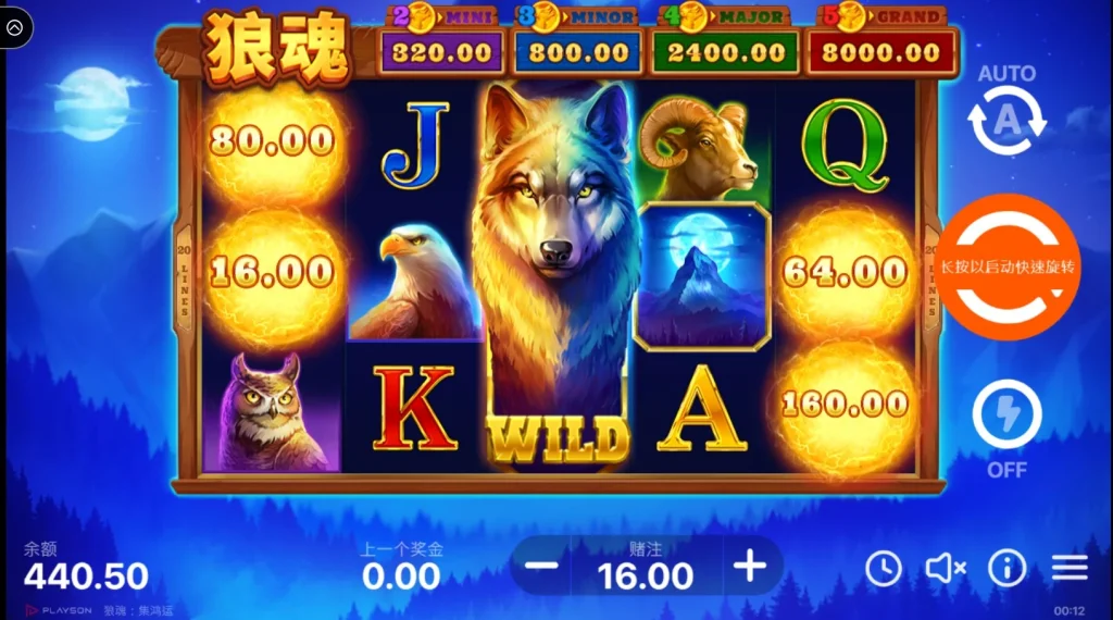 狼魂集鴻運的基本規則非常簡單,玩家只需旋轉轉軸,當相同符號連線時即可獲得獎勵。遊戲有20條固定賠付線,最低下注2.5元,最高可達2000元。
