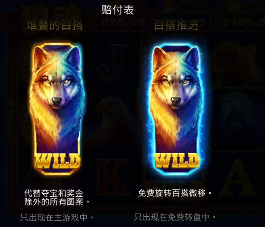 遊戲中的百搭符號是狼魂圖案,可替代除分散與獎金符號外的所有圖案。當主遊戲中的第2、3、4轉軸出現3個分散符號時,可觸發8次免費旋轉。