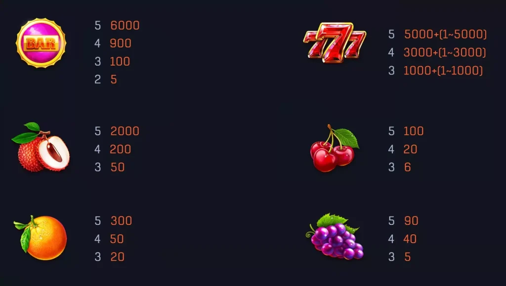 五個777圖標:可獲得5000倍指定倍數,再加上隨機1至5000倍獎勵。