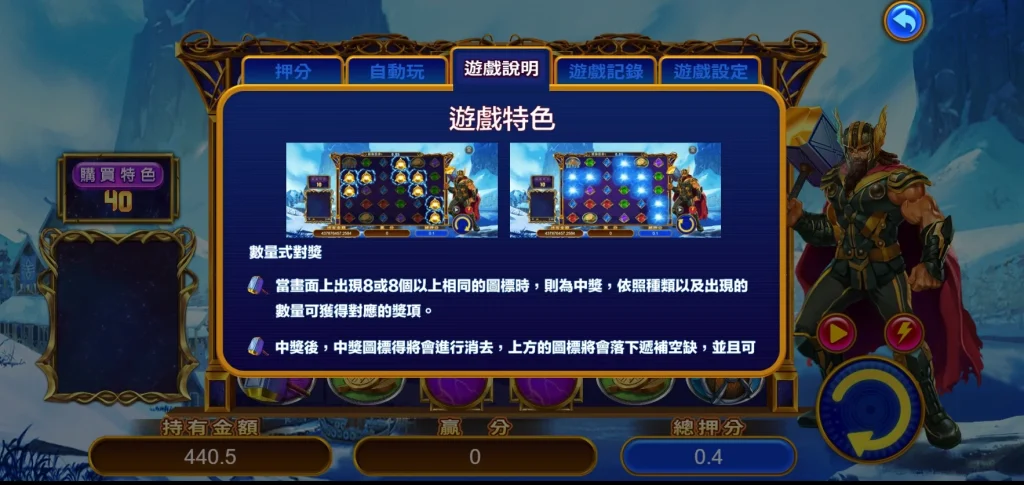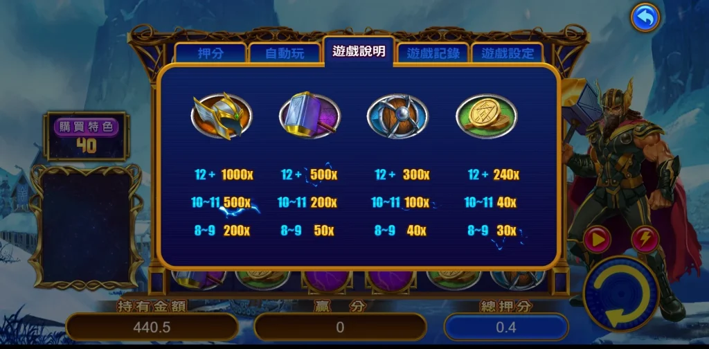 小編建議玩家們,如果想要提升遊戲體驗,可以適度嘗試購買特色功能,這樣能保證觸發免費遊戲,讓你立刻進入高分模式。不過也別忘了要保持理性投注,享受遊戲的樂趣最重要,趕快到富88娛樂城體驗雷神之力吧!這款遊戲絕對能讓你在冰雪雷神的世界裡,迎接財富與勝利的閃電般衝擊。