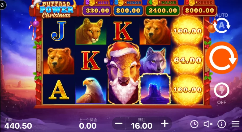 蠻牛向錢衝節日版的主要獎金符號包括棕熊、狐狸、水牛、狼和老鷹,每個動物符號都有特殊的倍率。當6個或更多的獎金和力量圖案出現時,會觸發專屬獎勵遊戲,進一步挑戰更高的獎金倍數。更棒的是,遊戲中的力量圖案在獎勵遊戲期間會黏住,為每次旋轉創造更多的中獎機會。