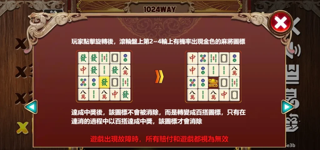 麻將來了老虎機運行於5×4軸設計,獨特的金色麻將圖標會在第2~4輪隨機出現,當達成中獎時,這些金色麻將會轉變為百搭圖標,不僅增加額外中獎機率,還能觸發連續消除的樂趣。此外,遊戲還提供逐級倍數加成,在免費遊戲階段中,中獎倍數最高可達5倍!最吸引人的部分就是連消的過程中,百搭圖標可以持續轉換,增加贏取大獎的機會。