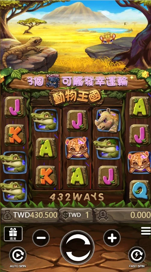 動物王國的最大特色是以非洲大草原為背景,搭配可愛的動物圖案,讓玩家仿佛置身於野生動物的棲息地中。遊戲採用432條中獎路線,讓玩家在每次旋轉中都有更多機會贏得獎金。WILD符號僅出現在第2、3、4輪,能替代其他符號(除SCATTER外),大大增加連線的可能性。而當玩家收集到3個SCATTER符號時,還能觸發幸運輪,有機會贏取高額獎金或10次免費遊戲!