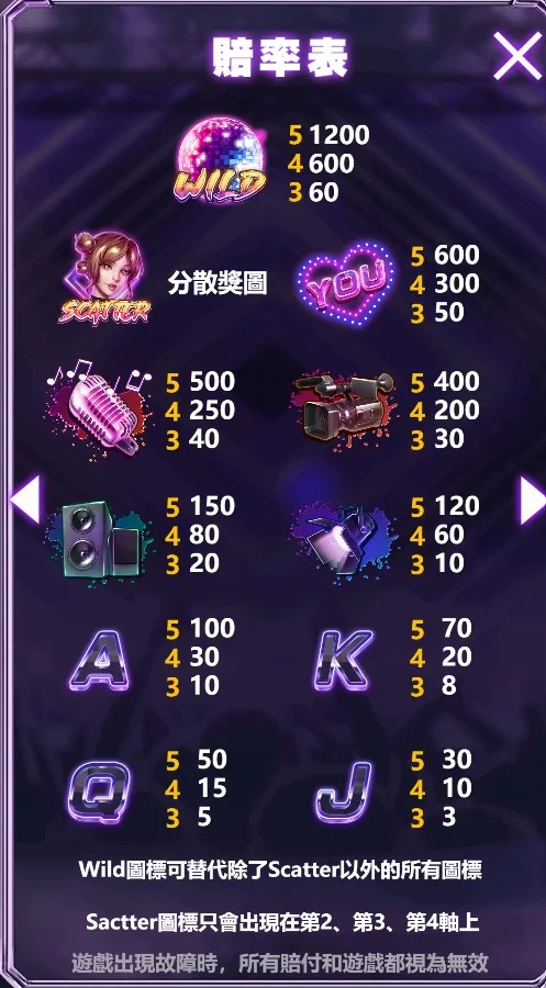 超級巨星老虎機的背景設計以演唱會現場為主軸,舞台中央閃耀著燈光,耳邊充斥著音樂與粉絲的歡呼聲,讓人身歷其境。視覺與聽覺的雙重享受,瞬間引爆你的遊戲熱情!