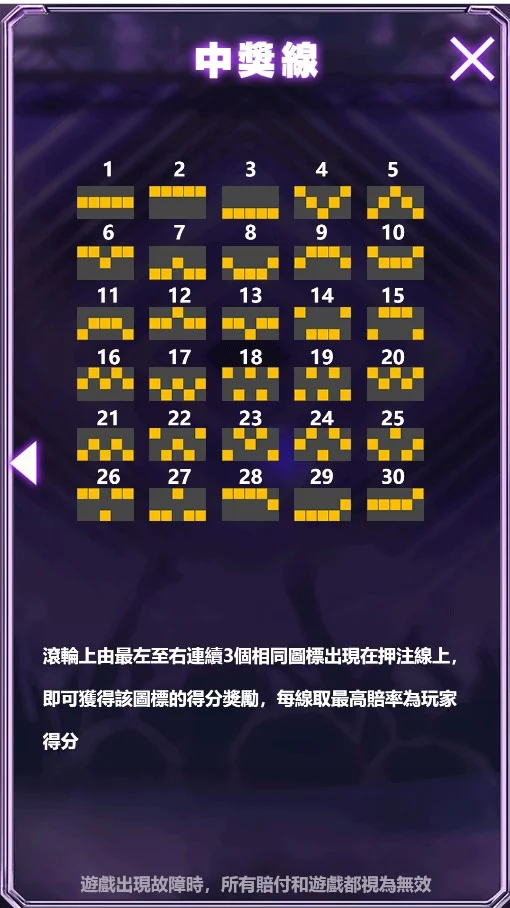 遊戲中有多達30條固定中獎線,並包含「百搭符號(WILD)」與「分散符號(SCATTER)」等特殊標誌。其中百搭符號彩球,可替代除SCATTER以外的所有符號,幫助你更快完成連線;而SCATTER符號則是進入免費遊戲的關鍵,獲得三個以上即可觸發10次免費旋轉次數。