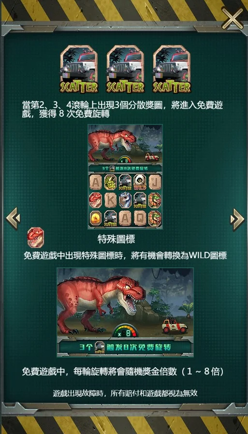 遊戲中最讓人期待的莫過於隨機觸發的免費遊戲模式,當捲軸上出現三個分散圖標(SCATTER),你將獲得8次免費旋轉的機會。此外,免費遊戲期間還有機會觸發1至8倍的獎金倍數,瞬間提升整體遊戲回報率!更別提遊戲中特殊的恐龍標誌,將進一步增加WILD符號的出現頻率,讓中獎率直線飆升。