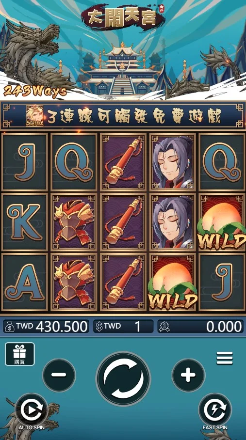 大鬧天宮老虎機結合了傳統神話故事和現代娛樂玩法,設計風格極具東方特色,讓玩家彷彿置身於仙界之中。這款遊戲採用243條中獎線規則,搭配百搭符號、免費遊戲和階段性獎勵,讓每一次旋轉都充滿期待。今天小編將深入剖析這款遊戲的特色,並分享三大致勝技巧,助你快速翻盤,成為真正的遊戲贏家!