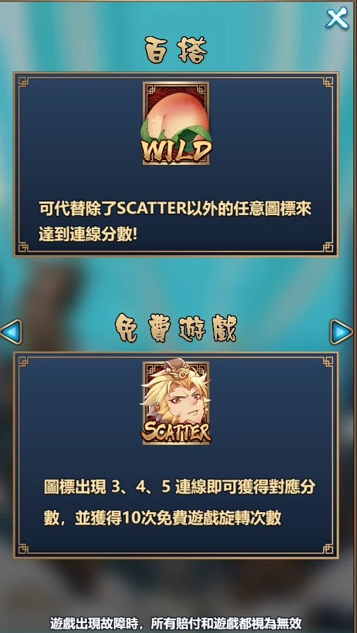 大鬧天宮以東方神話為背景,角色和符號設計充滿細節,例如金箍棒、仙將和玉帝等圖案,增添了遊戲的代入感。此外,百搭符號(WILD)可以取代除SCATTER外的所有符號,幫助玩家組合更多連線,提高中獎機率。