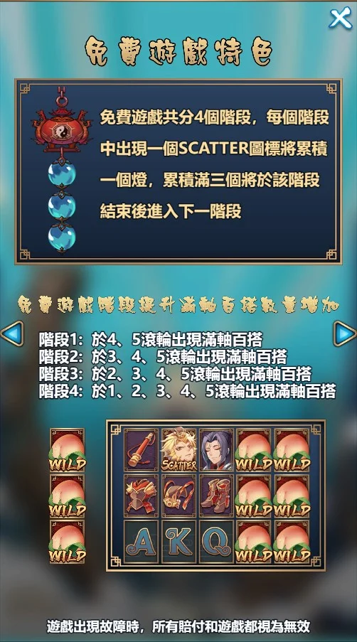 免費遊戲共有4個階段,隨著階段提升,百搭符號覆蓋範圍增大。例如,第1階段僅在第4、5轉軸出現滿軸百搭,第4階段則可覆蓋所有轉軸,創造超高額獎勵的機會。