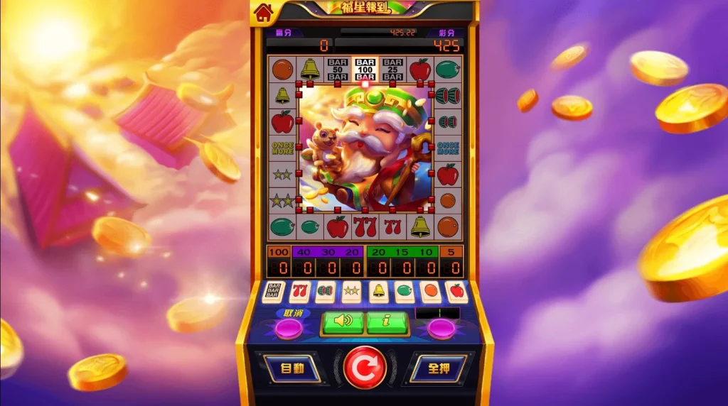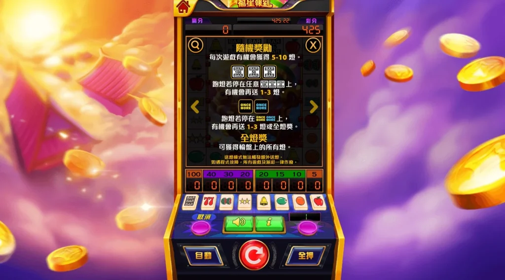 另外,福星報到最具魅力的特色之一,就是其創新的「跑燈機制」。這個玩法結合了隨機性與策略性,讓玩家在旋轉後還能有額外的期待。例如,當跑燈停留在Once More的位置時,你就能額外獲得1到3次的跑燈機會,甚至有機會觸發「全燈獎」,贏取整個螢幕的獎勵!這種玩法不僅提升了整體遊戲的互動性,也讓人對每一次旋轉充滿期待。