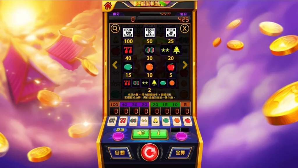 最後,遊戲特別設計了全自動和全押的按鈕,對於喜歡快速節奏的玩家來說,這無疑是一大福音。你可以用全自動功能進行多次旋轉,減少手動操作的麻煩;或者使用全押功能一次性賭上一切,追求那份一擊致勝的快感。無論你是喜歡慢慢玩,還是想要快速爆分,福星報到都能滿足你的需求,堪稱一款老虎機界的經典之作!