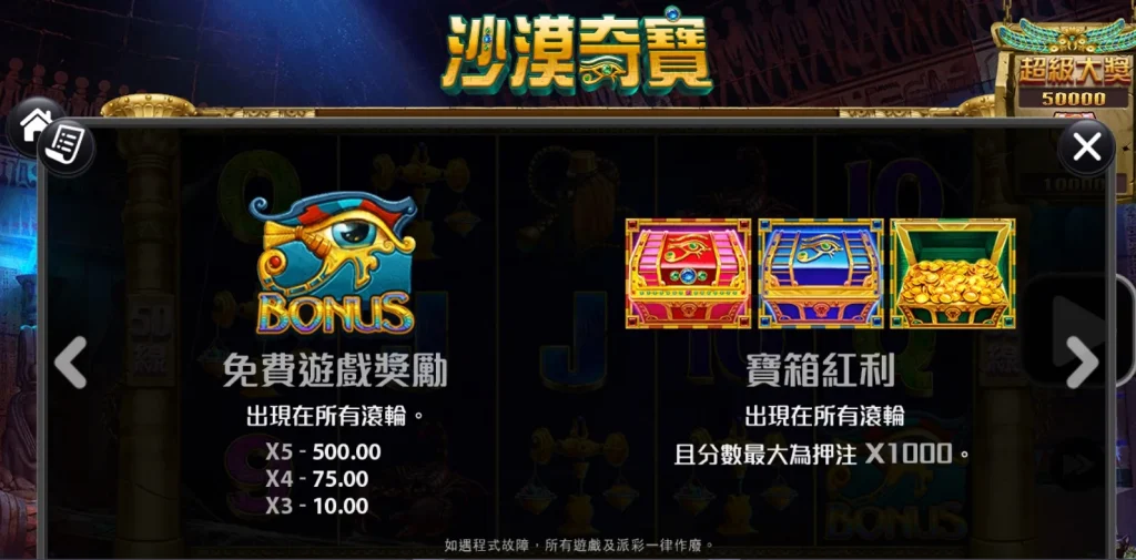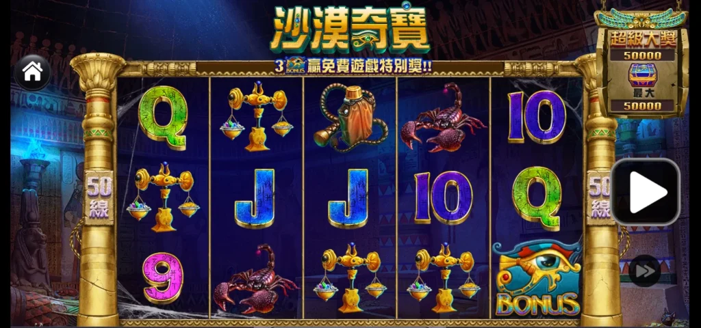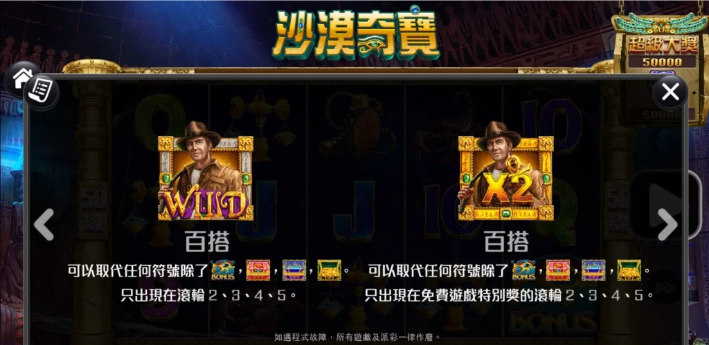 沙漠奇寶擁有50條固定賠付線,加上多種類的特殊符號,例如百搭符號和獎勵符號(BONUS),使得每一局都充滿驚喜。百搭符號(WILD)可替代其他符號,增加中獎的機會,而免費遊戲中的倍數加成更是提升彩金的重要關鍵。