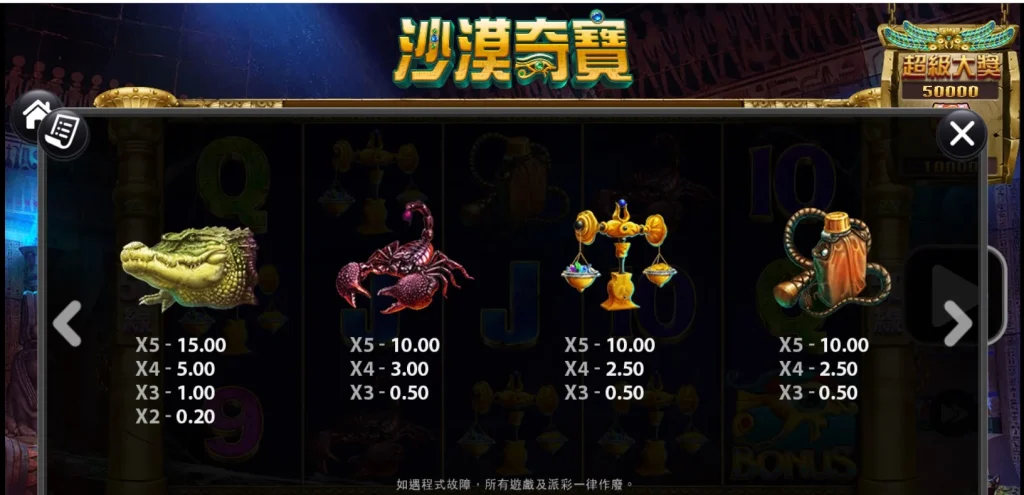 在畫面上,這款遊戲以古埃及的風格為基礎,圖案包括蠍子、鱷魚、平衡秤等經典元素,搭配豐富的特效和背景音樂,完美還原了探險的緊張與刺激。此外,沙漠奇寶還提供超級大獎功能,最高可獲得投注額的50,000倍,吸引不少玩家前來挑戰。