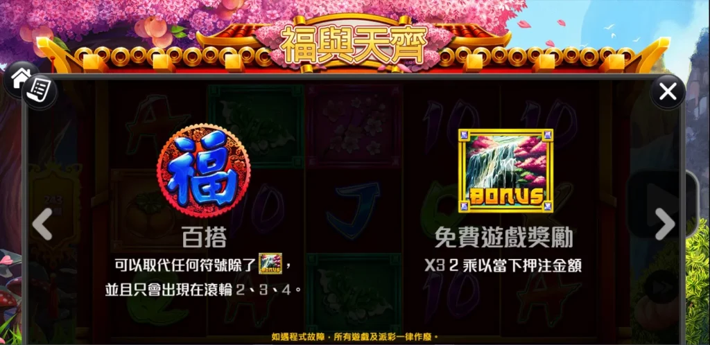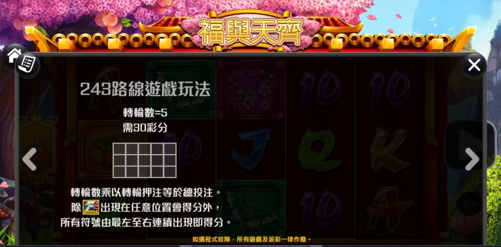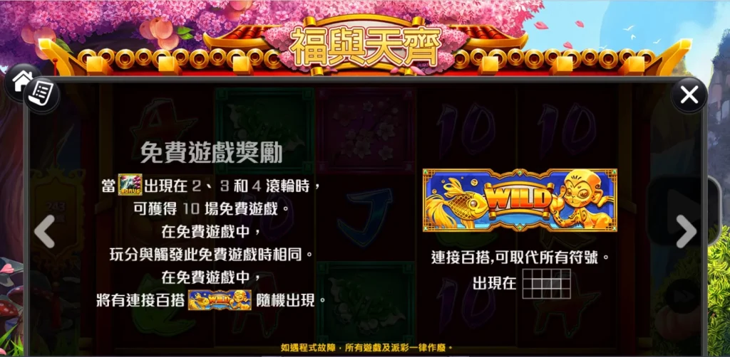福與天齊是一款五軸老虎機,採用了243條路線的中獎模式。簡單來說,只要從左至右的連線中出現三個或以上的相同符號,玩家就能輕鬆獲勝。遊戲中特別設計了「福」字百搭符號,可以替代除特殊符號(如BONUS)以外的所有符號,大幅增加組合的靈活性。此外,當出現3個BONUS符號時,還能觸發10次免費遊戲,並隨機附加連接百搭符號,大幅提升了玩家爆分的可能性!