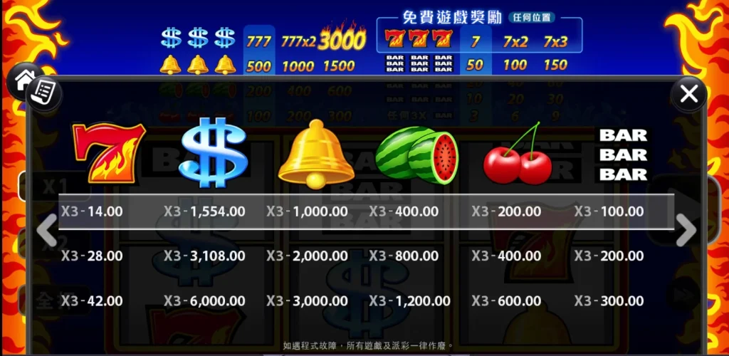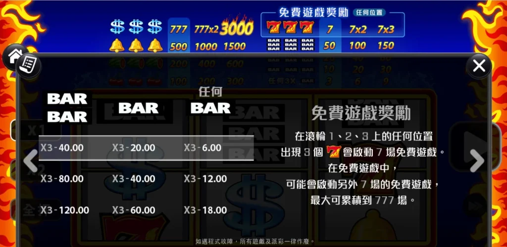 更特別的是,遊戲設計了免費遊戲機制,只要在第一、第二、第三軸上出現三個紅色7符號,就能觸發7場免費遊戲,並有機會額外獲得更多免費遊戲,累積最高可達777場!想像一下,每一次免費旋轉都可能帶來驚人的獎金,是不是超級心動呢?