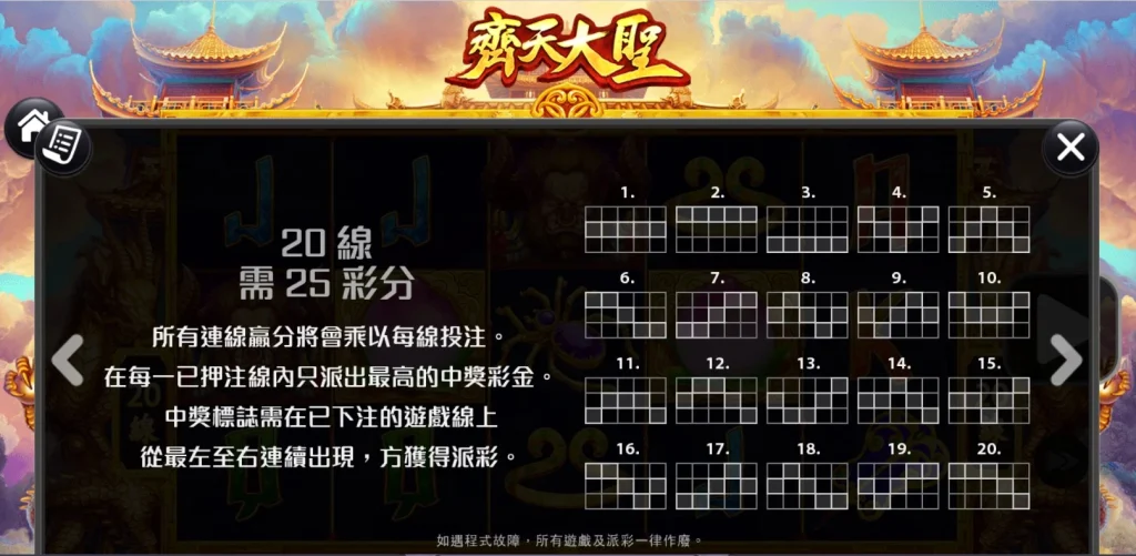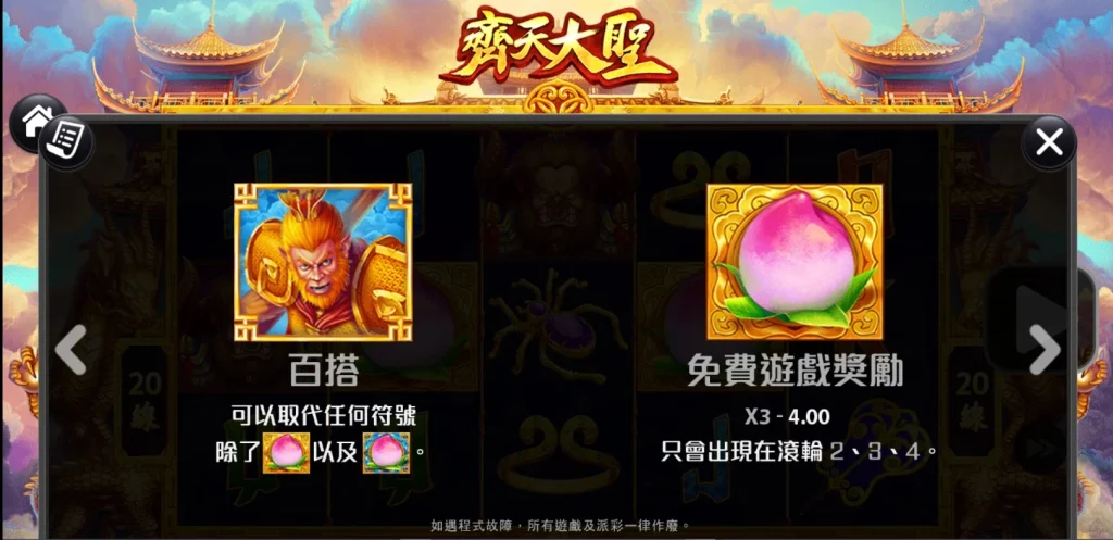 齊天大聖老虎機採用20條固定支付線,結合了經典的五軸轉輪設計。遊戲的百搭符號由孫悟空本人擔當,可替代除了免費遊戲符號與特殊獎項符號以外的所有符號,增加中獎的可能性!而當三個桃子符號出現在第2、第3和第4軸時,便可觸發高達15次的免費遊戲獎勵。在免費遊戲中,還有額外的機會獲得更豐厚的獎勵!這款遊戲的魅力在於其簡單又刺激的玩法,每一輪都充滿驚喜。