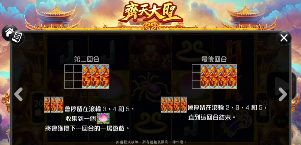 綜上所述,齊天大聖老虎機是一款融合了經典玩法與創新特色的老虎機遊戲,適合新手和資深玩家一同挑戰。無論是華麗的遊戲畫面,還是充滿驚喜的免費遊戲模式,都能帶來前所未有的遊戲體驗!