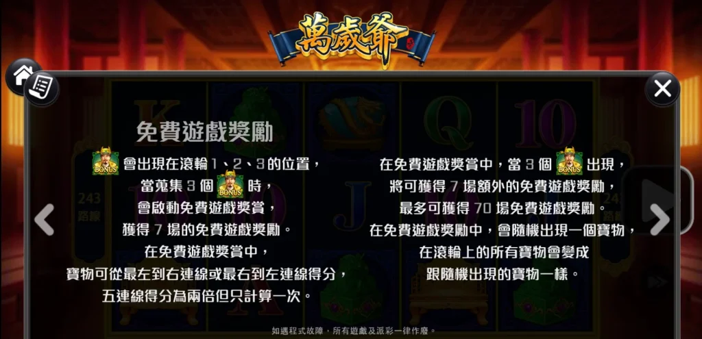 此外,萬歲爺的免費遊戲獎勵也極為吸睛。當玩家在第一到第三輪軸上集滿三個BONUS符號,就能觸發七場免費遊戲,且在免費遊戲期間,每次連線都有額外倍數加成,最高還能獲得多達70場的免費遊戲!這樣的設計不僅刺激,還讓人有更大的機會爆分贏錢。