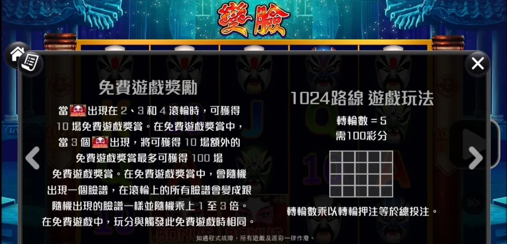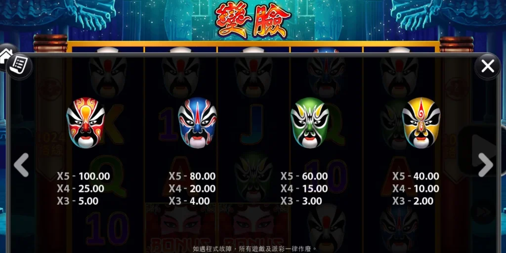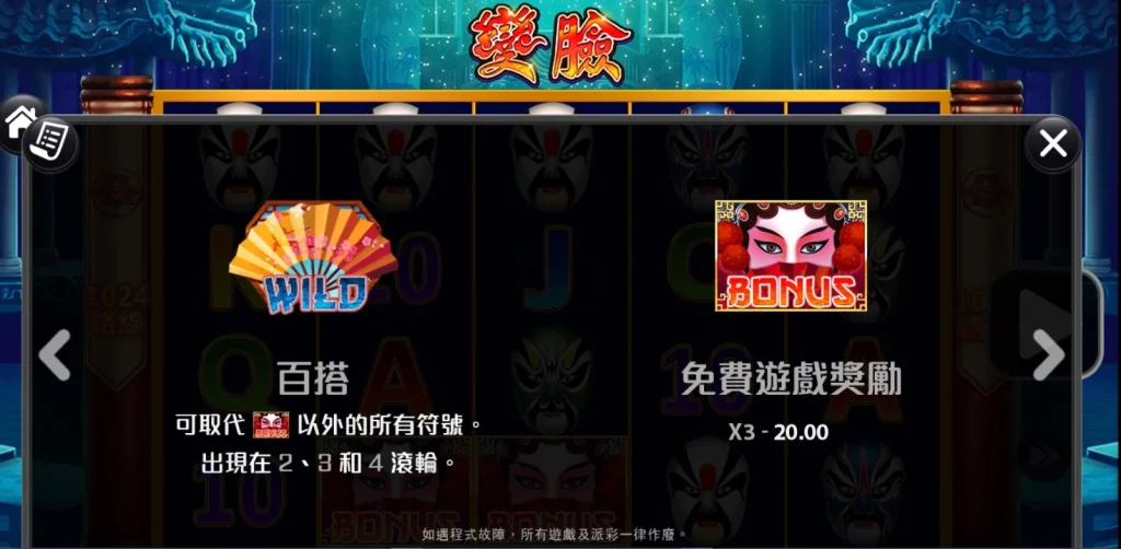 變臉老虎機是RK5電子推出的一款融合中國傳統藝術和現代遊戲技術的精彩作品。這款遊戲以川劇的變臉為主題,畫面華麗,背景音效更是帶入感十足,讓玩家彷彿置身於戲台之上。這款老虎機採用1024種贏獎路線,提供玩家更多中獎機會,同時還加入了百搭符號與免費遊戲機制,讓整體玩法更加多元且具吸引力,小編個人一玩就整個愛上!