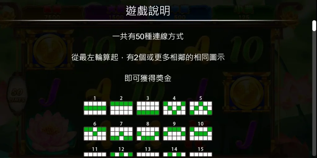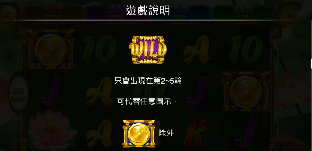 金銀鯉老虎機擁有50條連線方式,從左至右排列相同圖案即可獲得獎勵。也代表WILD也代表符號只會出現在第2到第5軸,能替代所有圖案(除BONUS外),幫助玩家完成更多中獎組合。