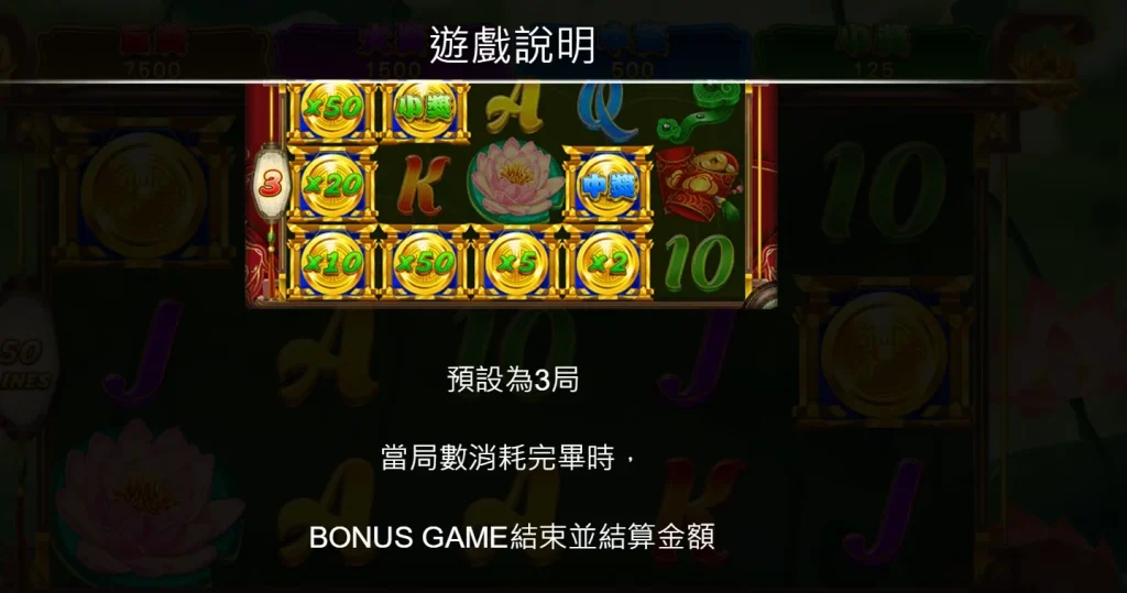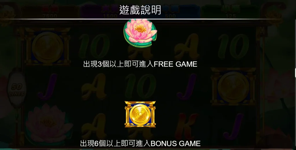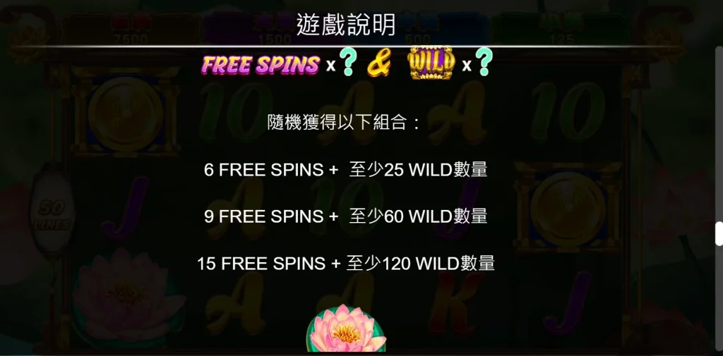 當盤面上出現3個以上的荷花符號,玩家即可進入免費遊戲,隨機獲得6、9或15次免費旋轉,並附帶大量的也代表WILD也代表符號強化中獎機率。而當6個或以上的金幣符號出現時,將觸發BONUS遊戲,讓玩家在三局預設中挑戰更高的獎金倍數。