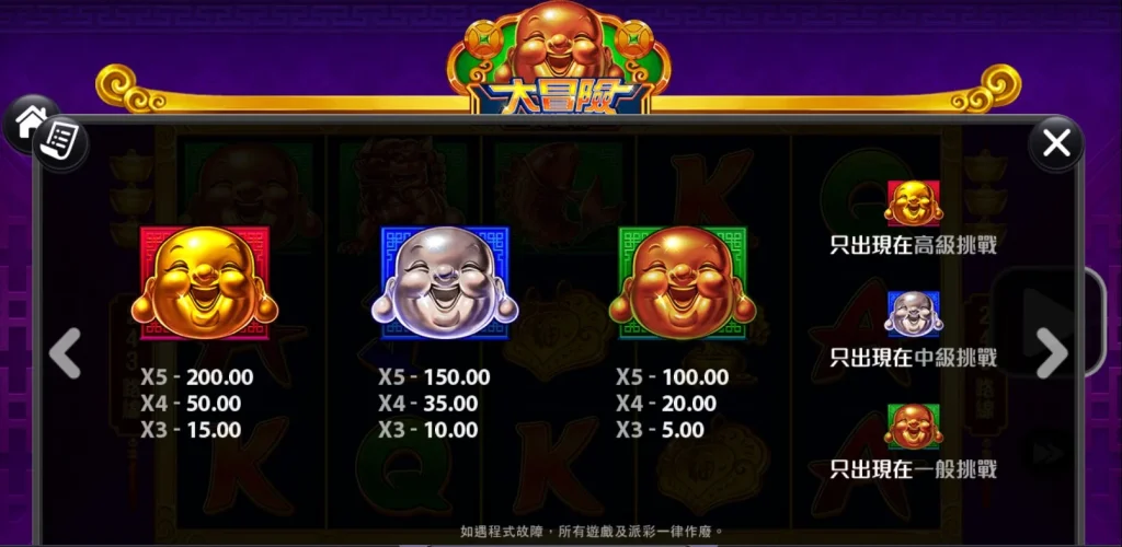 如果你是新手玩家,小編建議你先從一般挑戰模式開始,循序漸進地熟悉遊戲節奏;而如果你是資深玩家,那高級挑戰模式的高額回報一定會讓你愛不釋手。總之,大冒險笑彌勒是一款適合所有玩家的老虎機遊戲,無論是畫面、音效還是玩法,都能滿足你對遊戲的所有期待。