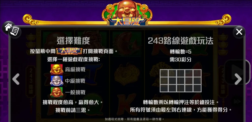 如果你是一個喜歡熱鬧畫風與吉祥主題的玩家,那大冒險笑彌勒老虎機一定能讓你眼前一亮!這款RK5電子推出的老虎機,以充滿喜氣的笑彌勒為主題,搭配色彩繽紛的設計,讓每一次旋轉都像是一場節慶派對。遊戲採用的是243條路線的玩法,任何連線都能輕鬆獲利,並帶來高達200倍的獎金可能!更棒的是,遊戲內還設有挑戰模式,分為一般挑戰、中級挑戰與高級挑戰,每一個難度等級都能讓玩家獲得不同程度的挑戰樂趣。