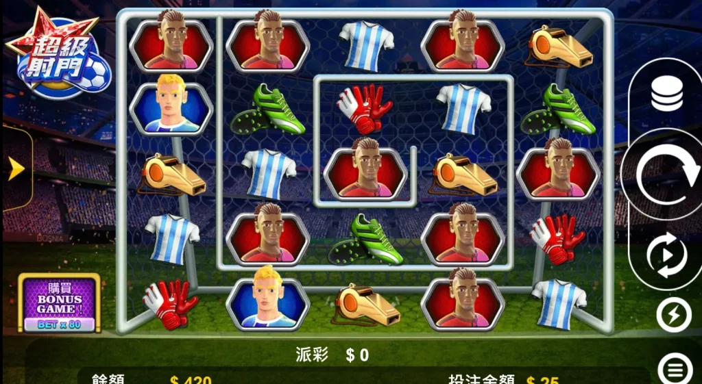 Bonus Game購買功能如果你是一位追求效率的玩家,超級射門還提供了購買功能,只需投注金額的80倍,即可直接進入Bonus Game,不需要等待觸發,快速體驗高獎金的刺激。