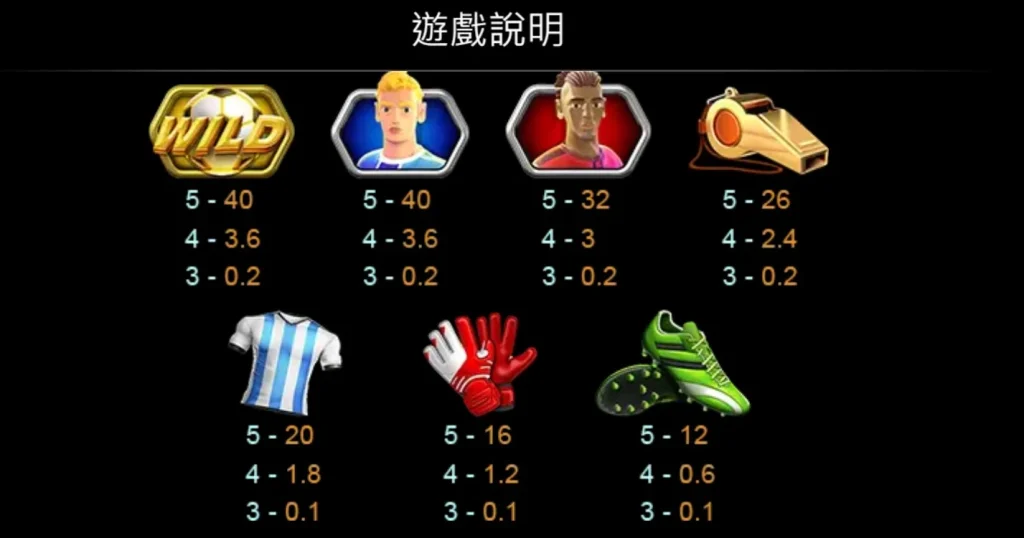 豐富的符號與高賠率遊戲中的WILD符號是一顆金光閃閃的足球,可以替代其他所有符號,增加中獎的機率。而兩位足球明星更是高賠率的象徵,五個相同符號最高可拿下40倍獎金!
