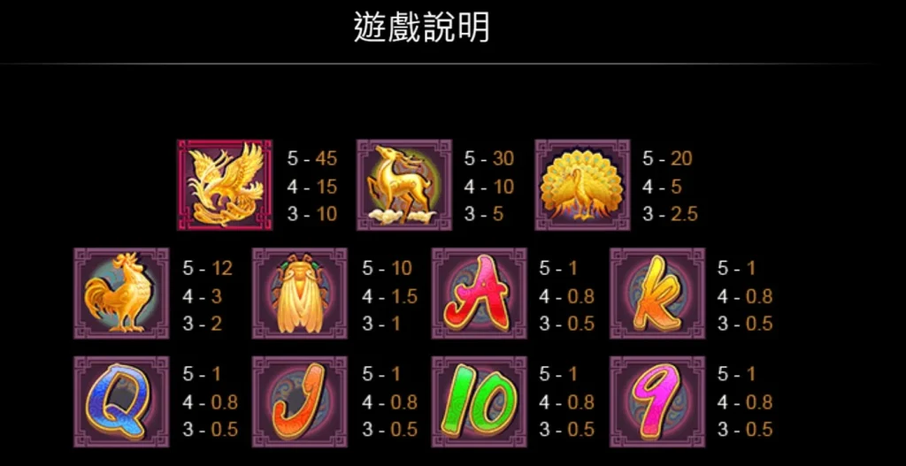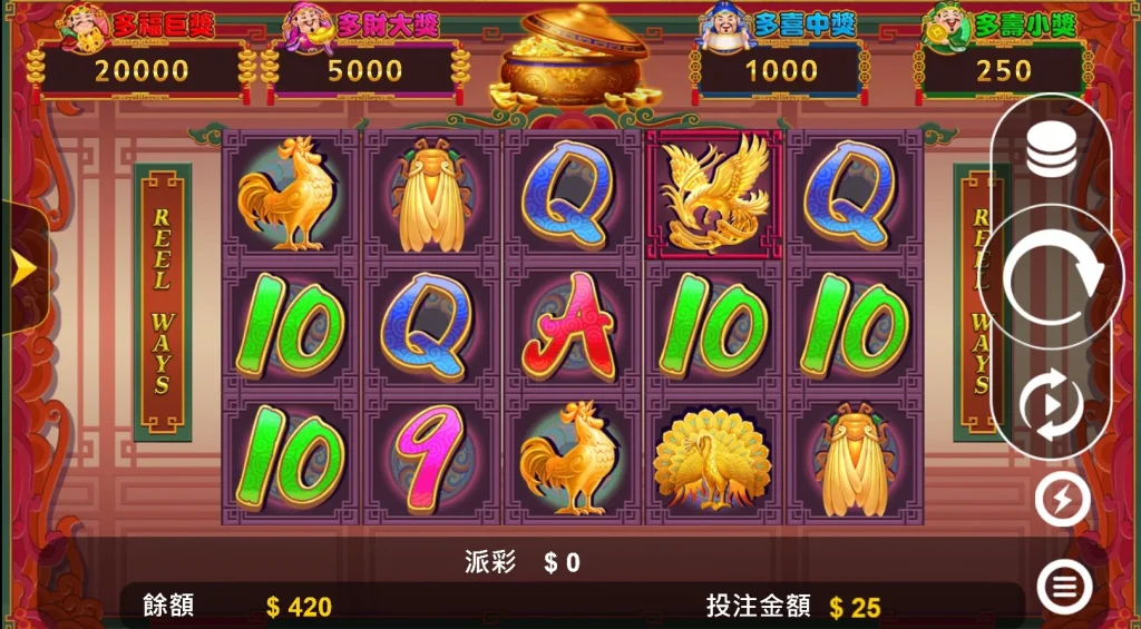 遊戲圖案包含金鳳凰、金雞、牡丹花等象徵吉祥的元素,搭配古典音樂背景,更增添了一種尊貴的感受。除此之外,遊戲特別設計了「多福巨獎」與「Pick Bonus」功能,讓玩家可以在緊張又刺激的同時,享受到大額獎金的樂趣。