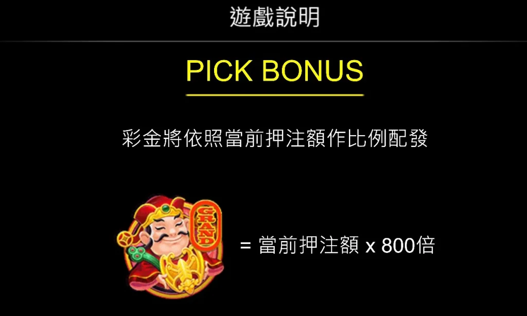 最吸引小編的還有遊戲的特殊機制,例如當「財」符號出現在第三輪時,所有獲得的獎金將乘以2倍,這個設計可以大幅提升中獎的刺激感。此外,遊戲還提供了「Pick Bonus」選項,玩家可以根據自己的直覺進行選擇,最高可以獲得投注額的800倍彩金,絕對是一個讓人眼睛一亮的亮點。