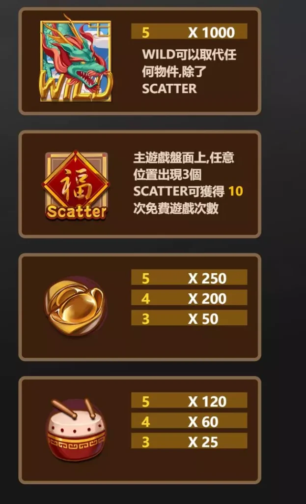 《福氣神龍》操作簡單,新手玩家也能快速上手。遊戲採用25條固定投注線,每線的下注金額將根據總押分自動分配,靈活滿足不同資金規模的玩家需求。
