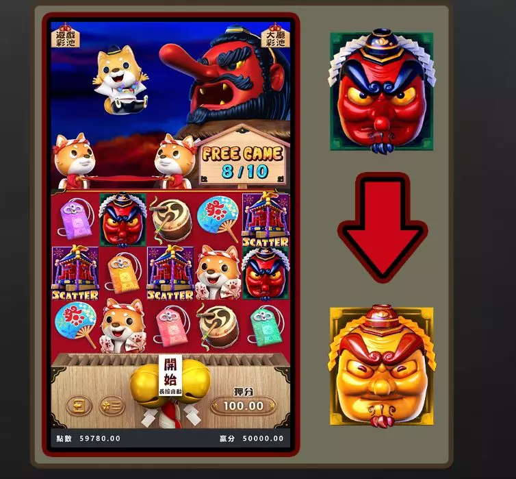 進入免費遊戲後,天狗神將變身為金色鎖定狀態,進一步提高連線機率與中獎金額。此時玩家只要好好把握連線機會,便有可能一舉贏得超級大獎!
