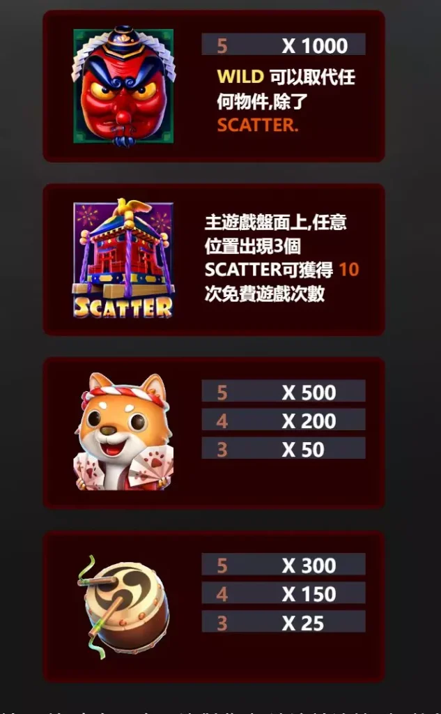 「天狗祭」採用經典的五輪25線設計,遊戲畫面上包含多種主題符號與特殊功能,讓玩家輕鬆理解規則並享受豐富的玩法。