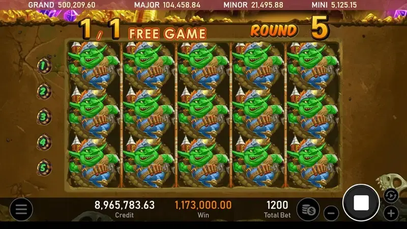 進入免費遊戲後,整體玩法會出現質的變化。不同於一般遊戲中百搭符號只佔一格,《礦工哥布林》在免費遊戲中啟用的,是全軸百搭符號機制,也就是整條轉軸上都會被百搭符號覆蓋,變成一整欄的任意牌。