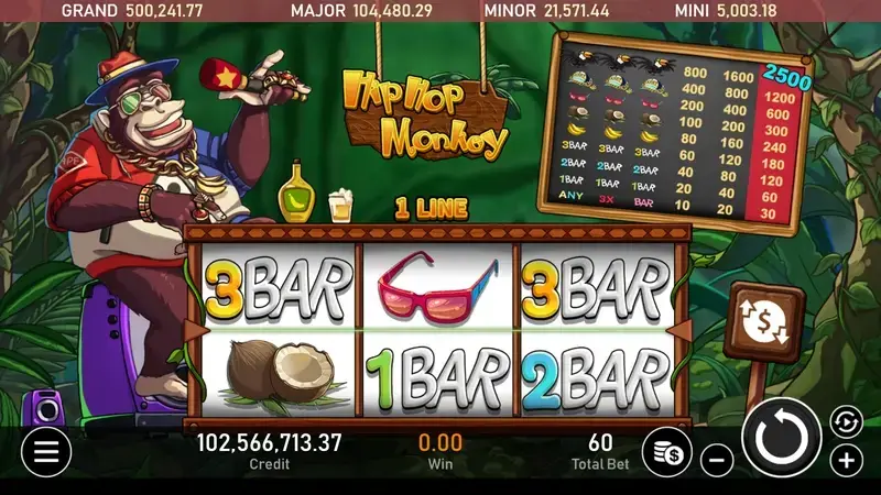 《嘻哈金剛》遊戲畫面充滿街頭潮流元素,主角是一隻活力四射、滿身肌肉、頭戴嘻哈帽的金剛,背景音樂則是動感的嘻哈節奏,讓玩家在每一次旋轉中都能感受到熱血氣氛。