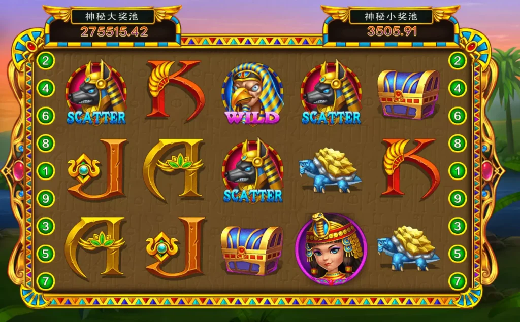 甜水綠洲》以古埃及神秘綠洲為背景,轉輪上可以看到法老頭像、金幣、聖甲蟲、眼睛符號等象徵古埃及文明的經典圖騰,視覺風格華麗卻不複雜,色彩運用金色與沙色為主,營造出一種奢華且神祕的氛圍。不論是對古埃及文化充滿興趣的玩家,或是單純追求遊戲畫面與沉浸感的娛樂愛好者,都能在這款機台中獲得高度滿足。