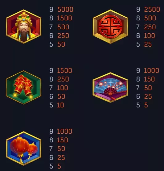 《財神的寶藏》中的圖標設計圍繞財神主題,其中最具價值的是財神符號,它代表最高倍數的連線獎金。此外,遊戲中其他圖標也具有不同的倍數獎勵,只需符號數量達標,即可觸發相應的獎金。
