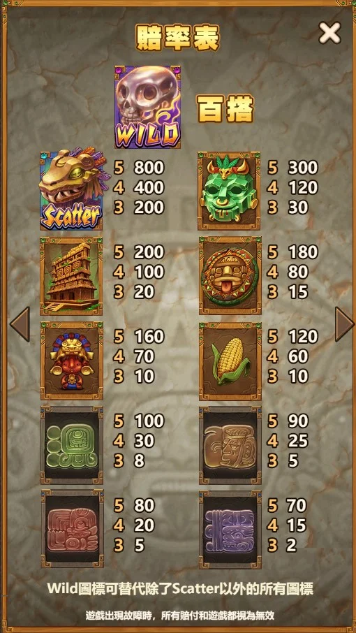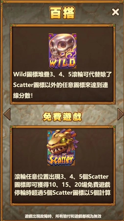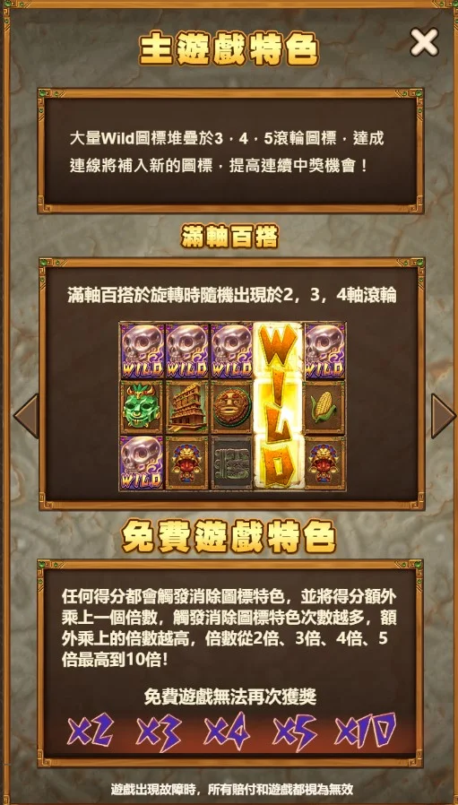 免費遊戲是瑪雅遺跡中賺取高額獎金的關鍵機制,當盤面上出現三個以上的Scatter符號時,就會觸發免費遊戲。免費遊戲不僅無需扣除你的投注金額,還有機會累積多次免費旋轉。在免費遊戲模式下,任何得分都會增加額外倍數,從2倍、3倍,一直到最高10倍,這對於追求高額獎金的玩家來說是個極大的優勢。